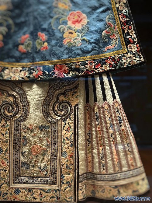 展览依据传统马面裙的美学演变为划分,先在序篇中呈现马面裙的形制起源,后以马面裙的定形与发展为题,共分为三个单元。第一单元“方兴未艾”,展示明代马面裙及其同期的袍,袄等;第二单元“百紫千红”,展示清代的阑干、月华、凤尾及百褶鱼鳞裙,辅以袄、褂,马面绣片等,呈现出清代丰富的裙型与华美的装饰;第三单元“简雅凝练”,展示20世纪初在西风东渐下,马面裙形制及装饰上的简化。