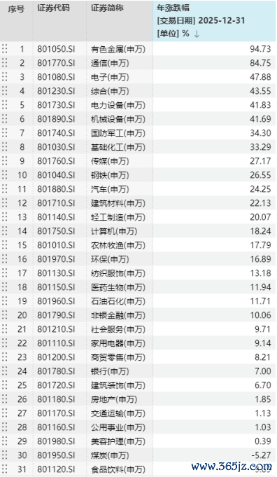 板块方面,31个申万一级行业中,有色金属行业以94.73%的全年涨幅高居首位;通信、电子行业分别上涨84.75%、47.88%,位居第二、三位;综合、电力设备、机械设备行业年度涨幅也超过40%。跌幅方面,仅煤炭和食品饮料两个行业全年收跌,食品饮料行业下跌9.69%表现垫底。
