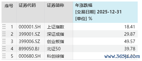 2025年A股行情宣告收官,上证指数最终报收3968.84点,年线上涨18.41%,创2020年以来的近6年最佳年度表现。深证成指、创业板指年线分别上涨29.87%和49.57%;北证50、科创综指年线分别上涨39.78%和46.30%。