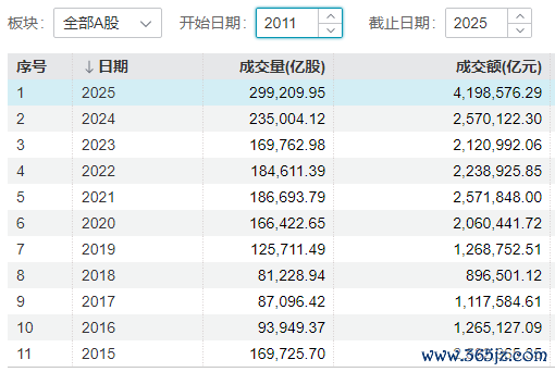 2025年,A股市场书写多项纪录,成交规模大幅放量是最突出的特征。Wind数据显示,2025年全部A股总计成交量为29.92万亿股,创历年新高;总计成交额为419.86万亿元,历史首次突破400万亿元,较2024年(257.01万亿元)放量63%。