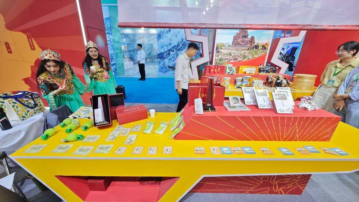 愚公故里遇上天山来客!文博会这个展区,飘着馍香与瓜果甜济源展厅以“愚公故里·文美济源”为主题,一抹清新的绿色主调,瞬间将观众带入王屋山的自然意境。这里不仅传承着敢想敢干的愚公精神,更将这份坚韧融入了一件件匠心之作中。白银城投资发展有限公司带来的食品级安全银器熠熠生辉,茶具、酒具等上千个品种,让传统银艺深度融入现代生活。一旁,甲素含量极高的济源冬凌草茶、古朴典雅的天坛砚、以火笔作画的葫芦烙画,共同勾勒出济源深厚的文化底蕴。“我们的王屋山愚公土炒馍香酥可口,制作技艺已经是省级非遗了。”展台负责人一句热情的介绍,瞬间让这份带着泥土芬芳的传承变得热气腾腾。