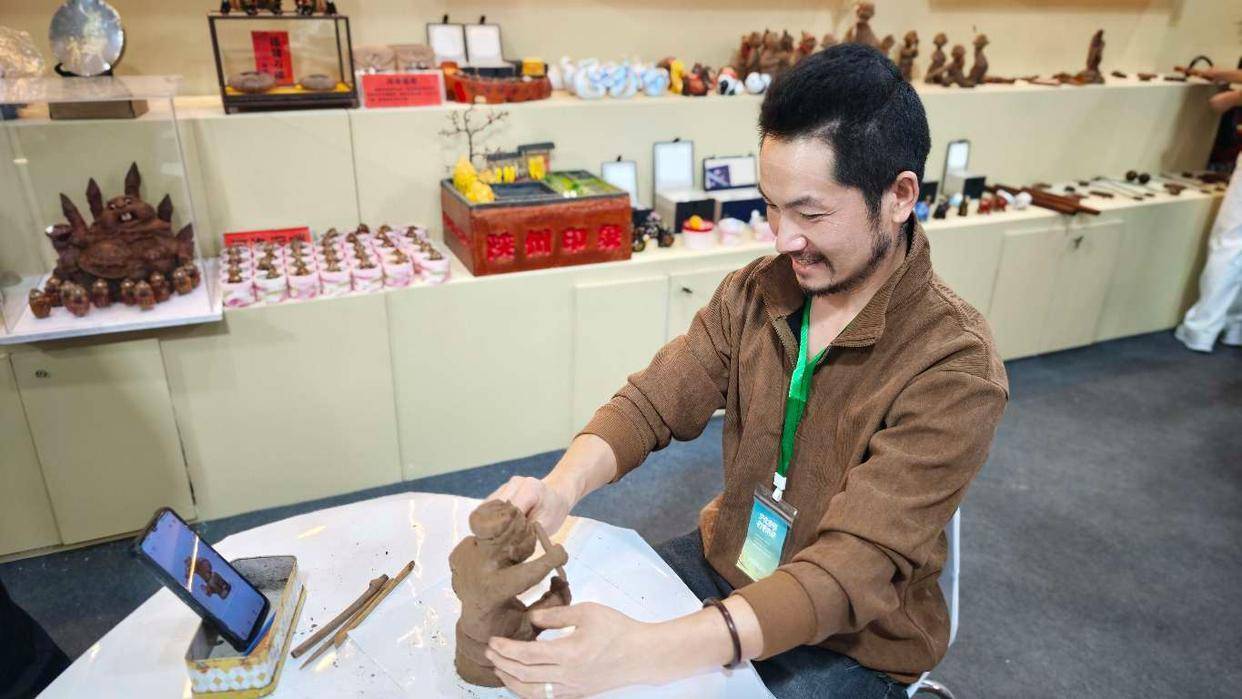 在黎阳炉善堂的展位前,臧风杰制作的铜炉典雅古朴,守正创新的技艺让古老纹饰在现代器型上焕发新生。匠仁玉雕工作室的覃亚波,则以巧夺天工的“巧色巧雕”技艺令人叹为观止,每一件玉雕都充满了生命的律动。若想亲手体验,拾间造物非遗馆无疑是最佳去处,这里集纳了从面塑到掐丝珐琅等十几种非遗项目,让参观者在指尖的揉捏、勾勒中,感受传统工艺在当代的生命力。